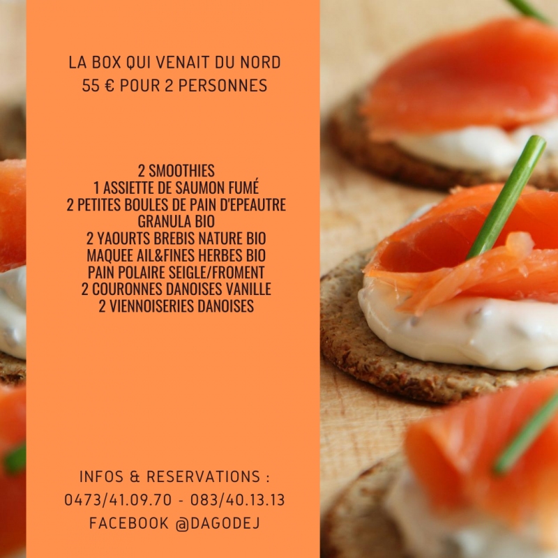 Smoothie, saumon fumé, pain d’épeautre, granula bio, yaourt de brebis artisanal bio, maquée ail et fines herbes artisanale bio, pain polaire, 4 viennoiseries.